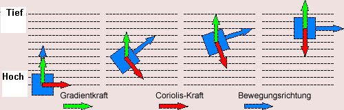 Man sieht also, dass die Corioliskraft ein durch die Druckgradientkraft bewegtes Luftpaket so lange nach rechts ablenkt, bis es senkrecht zu ihr fließt. Dieser dabei entstandene Wind fließt parallel zu den Isohypsen oberhalb der planetarischen Grundschicht. Man nennt ihn "Geostrophischen Wind". Die planetare Grundschicht ist die Schicht etwa unterhalb 1000 bis 1500 Metern, oberhalb derer keine Reibungskräfte herrschen und der Geostrophische Wind ungestört wehen kann. Isohypsen sind übrigens auf den Höhen-Wetterkarten die Linien gleichen Geopotenzials. Entlang einer Linie liegt beispielsweise die 500 hPa-Fläche auf 5520 Metern über NN.