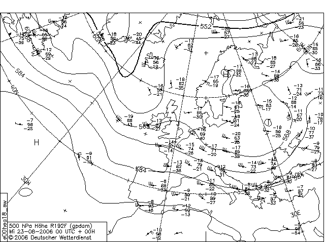 Nun haben wir also zusammenfassend gelernt, dass der durch die bloße Druckgradientktaft entsehende Eulersche Wind durch die Corioliskraft auf der Nordhalbkugel eine Rechtsdrehung erfährt, bis er parallel zu den Isohypsen weht. Hier eine entsprechende absolute Topografie (500 hPa) mit aus Radiosondendaten gewonnenen Windfiedern, die das ganze eben erläutertet veranschaulicht: