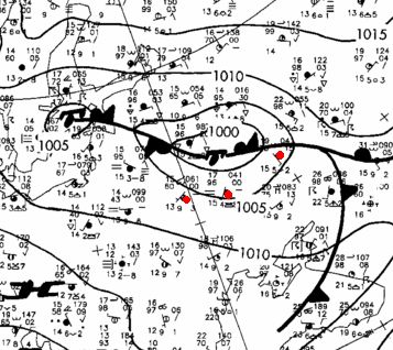 An der Bodenwetterkarte kann man dies immer wieder gut erkennen. Ich habe hier ein Beispiel, bei dem ich die entsprechenden Windfiedern, an denen man dies gut erkennen kann, rot markiert: