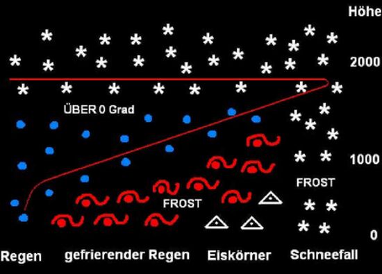 Hier eine Grafik, die dies verdeutlichen soll. Ich habe eine Schicht eingezeichnet, in der die Temperaturen über 0 Grad liegen. Diese Schicht schiebt sich nun von links nach rechts in die Frostluft hinein und gleichzeitig fällt Schnee von oben herab in diese Schicht. Von rechts nach links wird diese Schicht (Aufgleiten) immer dicker. Ganz rechts fällt der Schnee bis zum Boden, weiter links schließt sich eine Zone mit Eiskörnern an, weil die bodennahe Kaltluftschicht dick genug ist, damit die unterkühlten Tropfen (sie weisen Werte unter 0 Grad auf) wieder gefrieren können und zu "Eiskörnern" werden. Noch weiter links fällt dann nur noch flüssiger "gefriereder Regen" (auch etwas missverständlich als "Eisregen" bezeichnet) . Ganz links hat sich dann die Warmluft zum Boden durchgesetzt, es herrscht Tauwetter und es regnet ohne Eisbildung am Erdboden.