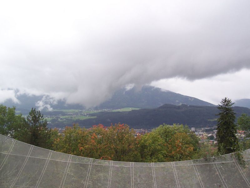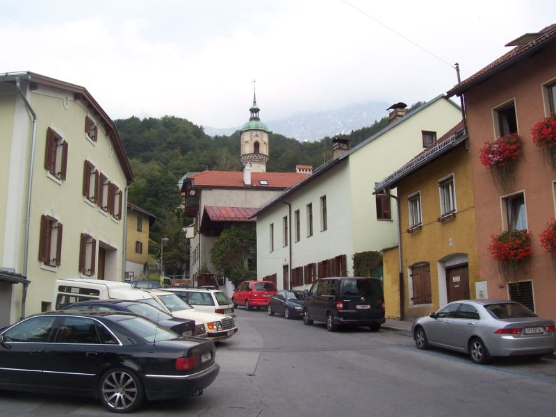 Innsbruck Ortsausgang Richtung Nordkette. Bewölkter Himmel. Es liegen 700 Höhenmeter Aufstieg vor mir.